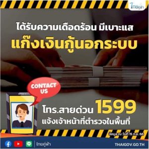 หากประชาชนได้รับความเดือดร้อนจากแก๊งเงินกู้ผิดกฎหมาย หรือมีเบาะแสที่เป็นประโยชน์ สามารถแจ้งได้ที