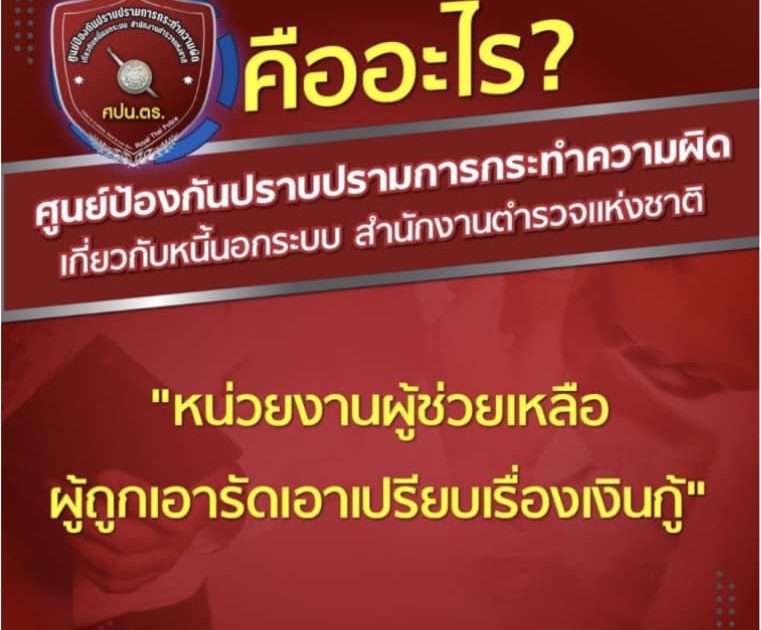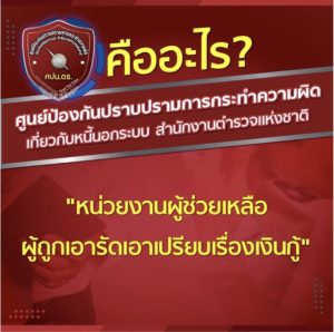 โดยมี “ศูนย์ป้องกันปราบปรามการกระทำความผิดเกี่ยวกับหนี้นอกระบบ” (ศปน.ตร.) เป็นศูนย์รับเรื่องร้องเรียนจากผู้เสียหายทั่วประเทศ ที่ได้รับความเดือดร้อนจากเงินกู้นอกระบบหลายรูปแบบ เช่น